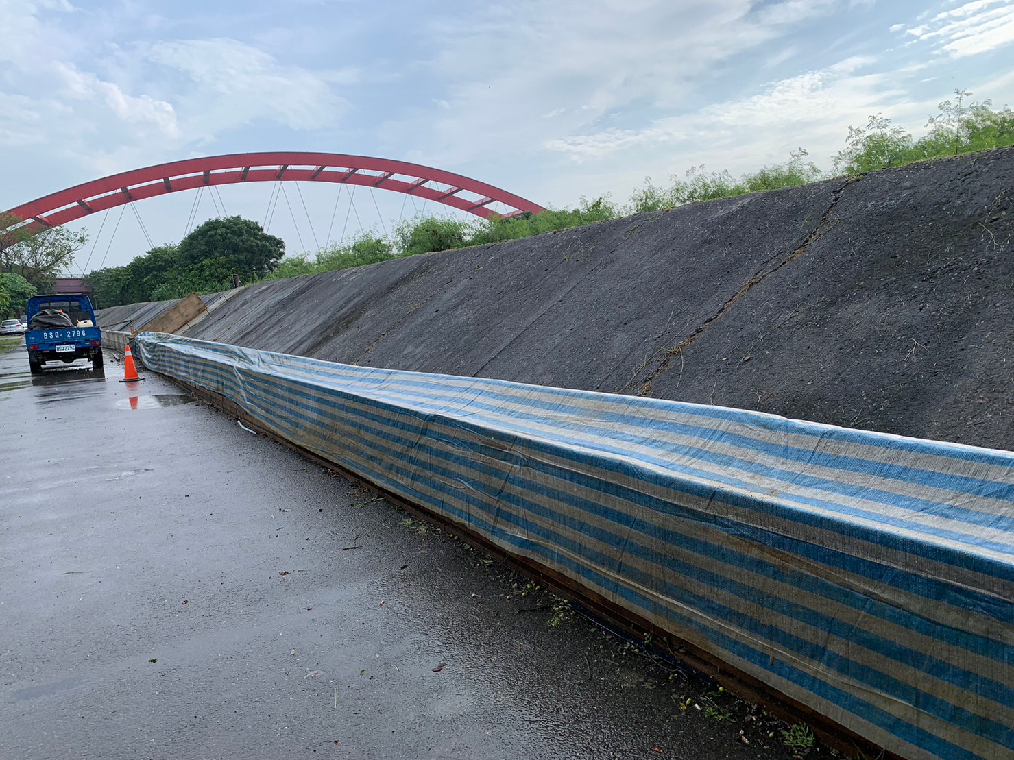 堤後坡綠化_客土覆蓋帆布避免豪雨沖蝕。